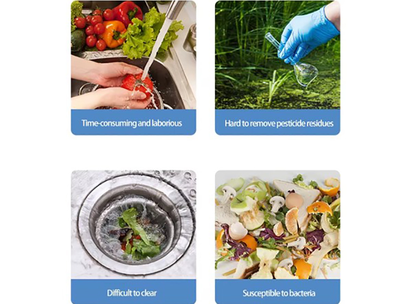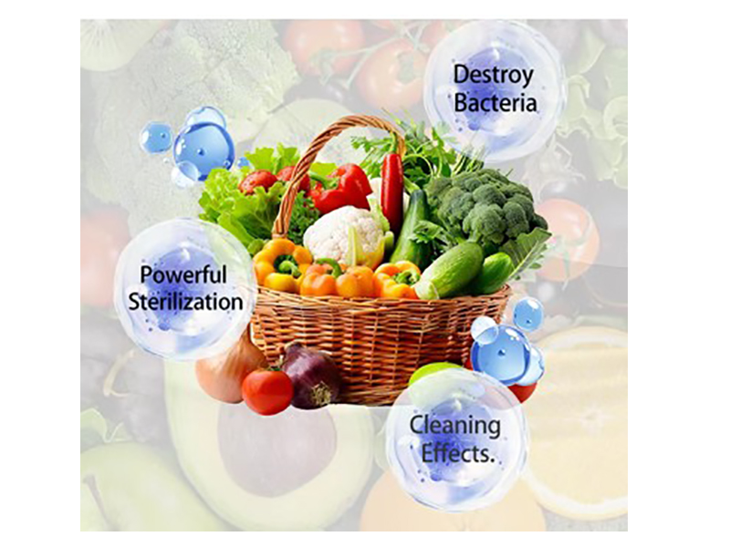 - Mašina za pranje povrća i voća temeljno čisti pomoću cirkulacije vode, metodom vrtložnog spreja (stvara mehuriće) za uklanjanje pesticida i sterilizaciju ozonom (ozon ubrzava proces razlaganja bakterija, pesticida).