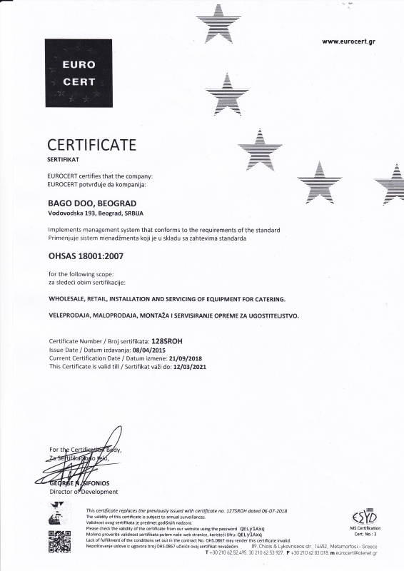 Bago doo primenjuje sistem menadžmenta koji je u skladu sa zahtevima standarda OHSAS 18001-2007Standard OHSAS 18001 (Occupational Health & Safety Assessment Series) je standard koji definiše zahteve za sistem menadžmenta zdravljem i bezbednošću na radu.